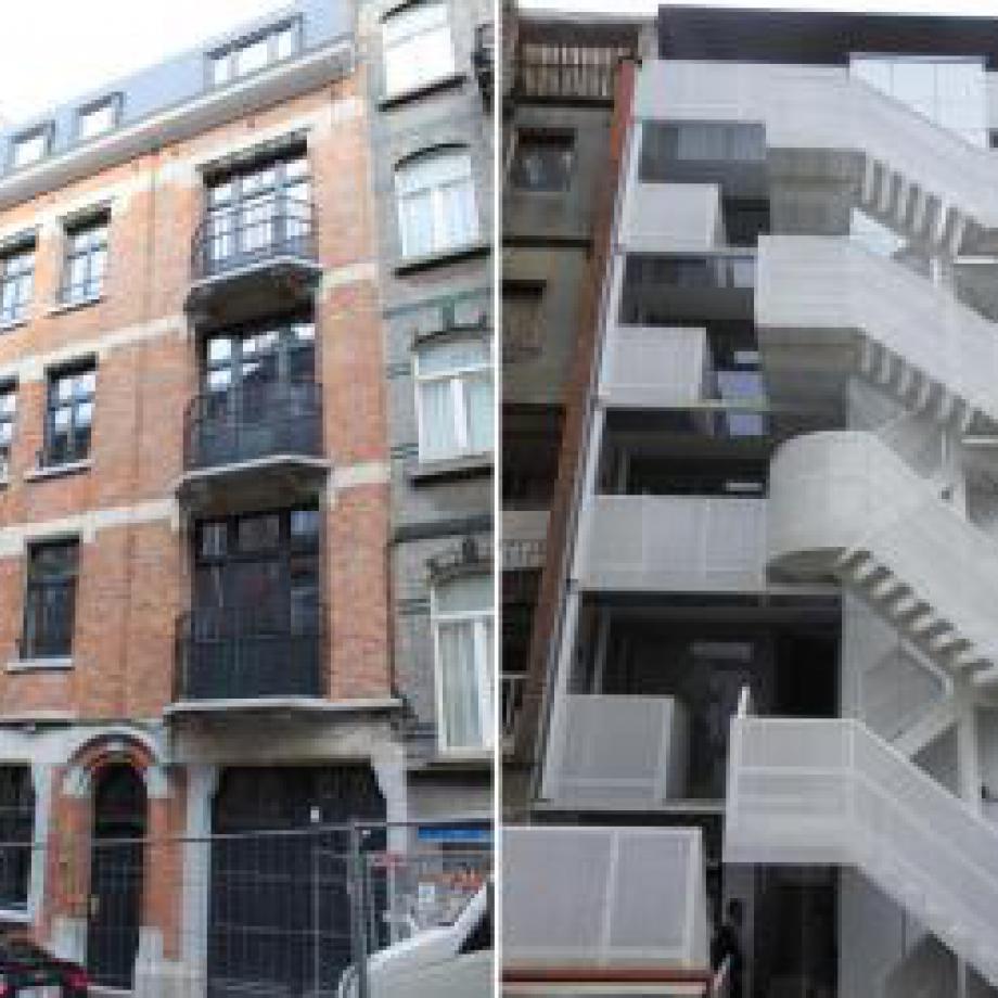 Les logements qui se situent en front de rue ont été totalement rénovés, mais la façade avant a été conservée. Un escalier métallique et un ascenseur extérieur allant jusqu’au sous-sol ont été créés afin de faciliter les déplacements des futurs habitants.